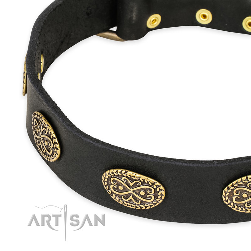 Royal Quality FDT Artisan Black Leather Dog Collar with Old Bronze Look Decorations